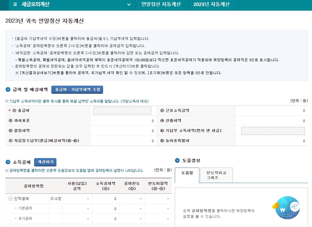 '2023 귀속 연말정산 자동계산' 화면에서 자세하게 모의계산을 해 볼 수 있다.