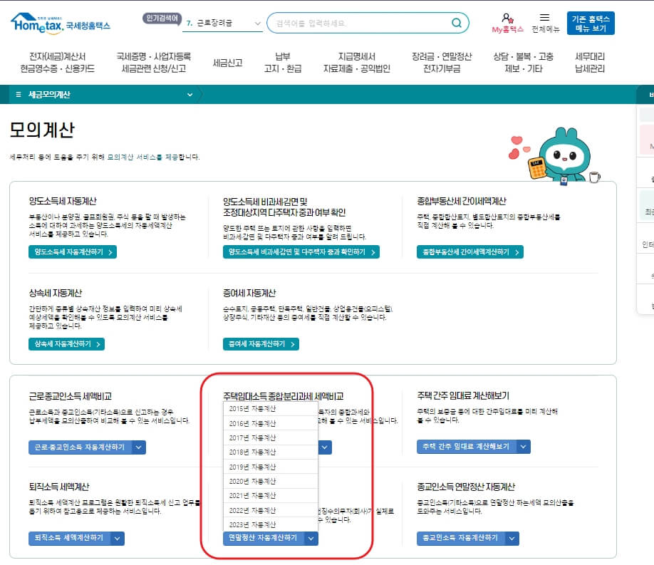 홈택스 접속 후, 우측 하단의 '모의 계산'을 클릭한다.