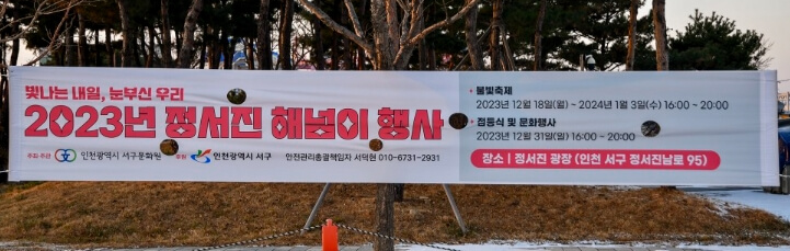 12월 31일에 개최하는 정서진 해넘이 행사는 인천서구문화원에서 주관하는 행사로, "빛나는 내일, 눈부신 우리"라는 타이틀로 정서진 광장에서 진행됩니다.