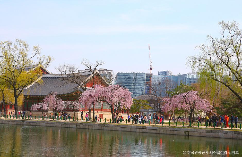 경복궁은 다양한 봄꽃을 만나볼 수 있는 5대 궁궐 중 한 곳입니다. 경복궁 서북쪽에 있는 누각인 경회루 주변에는 가지가 길게 늘어선 수양벚꽃이 둘러싸고 있어 더욱 화사한 풍경을 만나볼 수 있습니다. 고즈넉한 풍경 속, 포근한 봄기운을 느낄 수 있습니다.