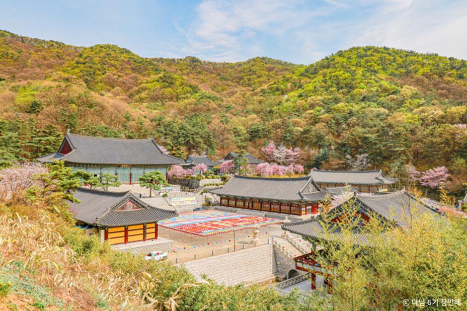 충남 천안에 위치한 각원사는 1975년 창건된 사찰로 겹벚꽃 명소로 유명합니다. 풍성한 겹벚꽃 뿐만 아니라 홀벚꽃, 능수벚꽃 등 다양한 형태의 벚꽃이 만발하게 핍니다. 특히, 높이 15m, 무게 60톤에 달하는 청동대불 앞에 벚꽃이 흐드러지게 피어 아름다운 풍경을 연출합니다.