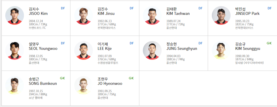 - GK: 김승규(알샤밥) 조현우(울산 HD) 송범근(쇼난벨마레)