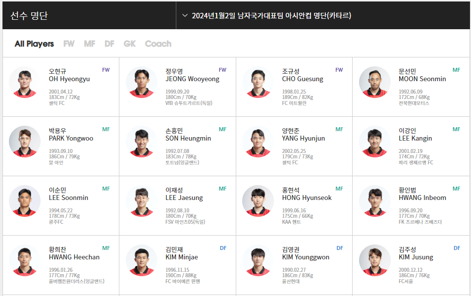 위르겐 클린스만 감독의 지휘하에 2023 AFC 카타르 아시안컵에 출전하는 대한민국 선수단입니다.
